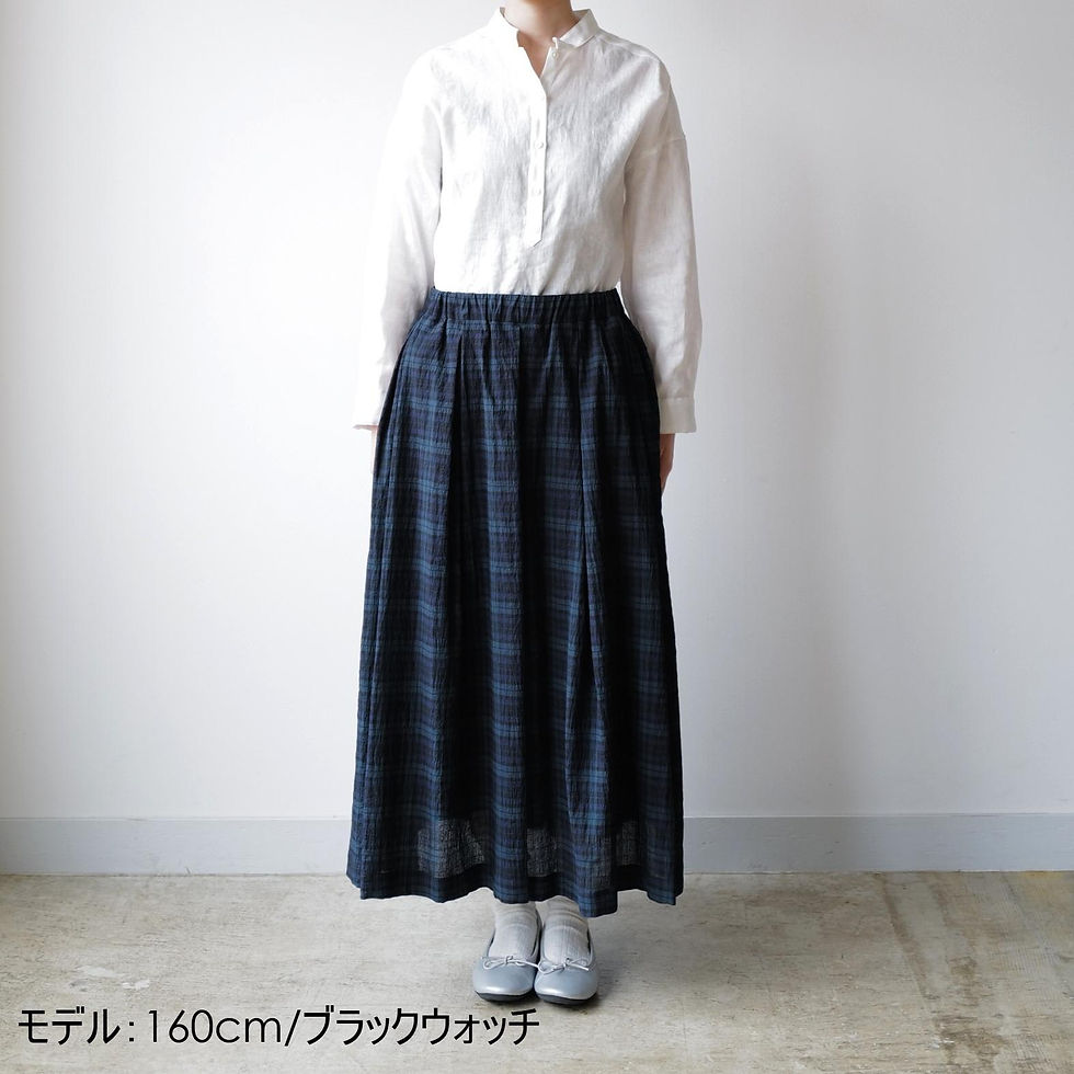 全体にタックを入れ、ほどよいボリュームをもたせたロングスカートです。生地をたっぷり使いながらも、広がりすぎず落ち着いた印象に仕上げました。
